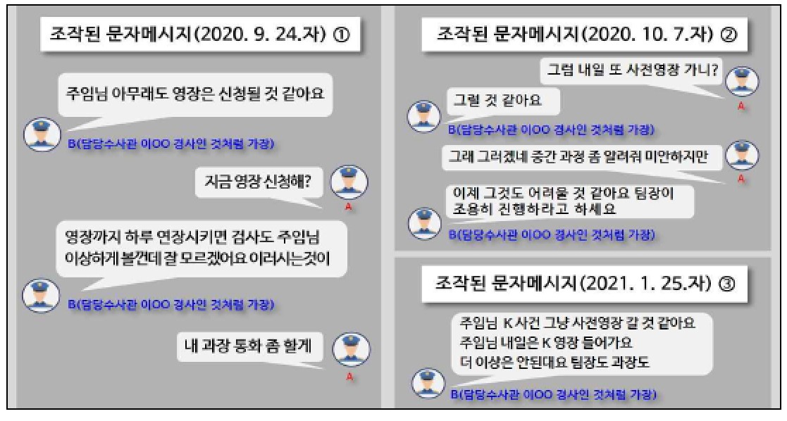 ❍ 이에 B는 A가 담당 사건의 피의자인 K로부터 뇌물을 수수하고 있다는 사실을 알면서도, ’20. 9. 24.~ ’21. 1. 25. 3회에 걸쳐 사건 담당 경찰관을 가장하여 A에게 ‘K에 대해 구속영장이 신청될 것 같다’는 취지의 허위 문자메시지를 보내고, A는 이를 K에게 보내 추가로 뇌물을 수수함