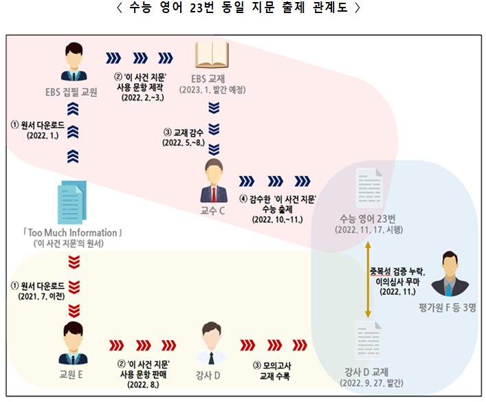한편, 2023학년도 수능 시행(2022.11.17.) 이후, 강사 D의 수능 전 발간(2022.9.27.)된 교재의 ‘이 사건 지문’이 수능 영어 23번 문항에 동일하게 사용되어 출제된 사실이 밝혀졌는데,