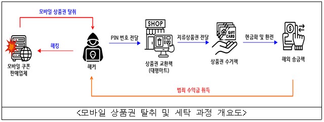 이들은 2024. 8. 17.~8. 18. 모바일 쿠폰 판매업체의 시스템에 불상의 방법으로 취득한 관리자 계정으로 침입하여, 모바일 상품권을 주문하고 이를 자신들이 지정한 휴대전화로 수신하는 방법으로 30억원 상당의 모바일 상품권 7,687개를 탈취한 혐의를 받고 있음