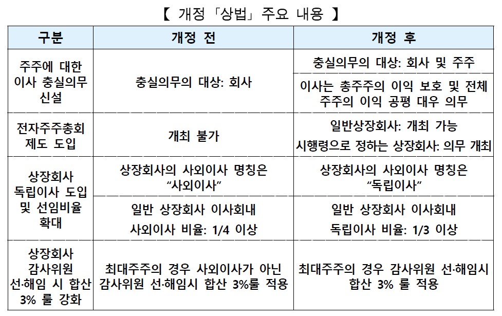 오늘(7. 15.) 이사의 주주에 대한 충실의무 신설, 전자주주총회 도입, 상장회사 사외이사 명칭 “독립이사” 변경 및 의무선임 비율 확대, 상장회사 감사위원 선·해임 시 3% 초과 의결권 제한 정비 등을 내용으로 하는 개정 「상법」(7. 3. 국회 본회의 통과)이 국무회의에서 의결되었습니다.
