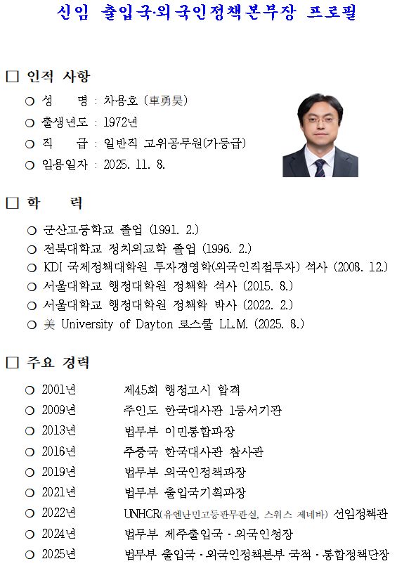 ○ 신임 차용호 출입국·외국인정책본부장은 전북대학교를 졸업하고 2001년 행정고시에 합격해 공직에 입문한 후, 서울대학교 정책학 석사 및 ‘이민과 지역경제’를 주제로 정책학 박사 학위를, 미국 University of Dayton 로스쿨 법학석사(LL.M.)를 취득하였으며, UNHCR 본부 선임정책관, 제주출입국·외국인청장, 국적·통합정책단장 등 해외, 본부 및 일선 현장을 두루 거친 출입국·이민행정 전문가입니다.