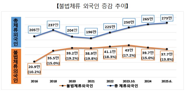 ※ (불법체류 감소 추이) ’23. 10월 43만 명 -> ’25. 6월 37만 명