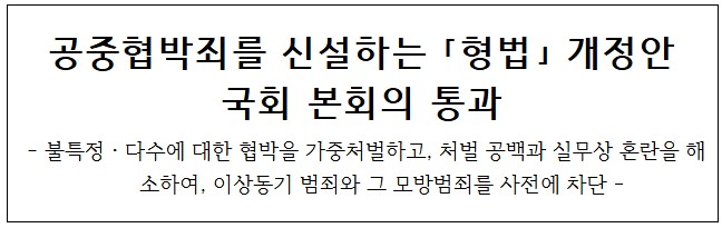 ❍ 불특정・다수를 대상으로 한 살인 예고 등을 처벌하는 ‘공중협박죄’를 신설하는 「형법」 개정안이 오늘(2. 27.) 국회 본회의를 통과하였습니다.
