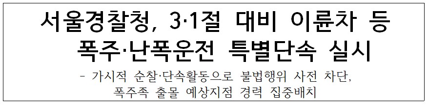 서울경찰청은 3·1절을 앞두고 도로 위 평온을 위협하고 시민 불편을 초래하는 이륜차 등 폭주·난폭운전에 대한 특별단속을 실시할 예정이다.