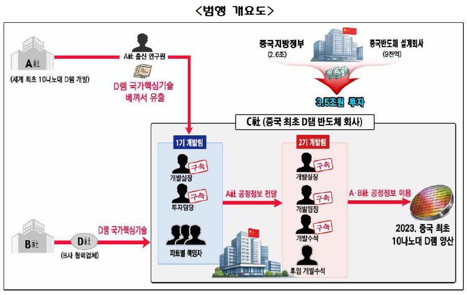 - 중국 최초의 D램 반도체회사 C社가 국내 A社의 10나노대 D램 국가핵심기술*을 불법 유출ㆍ부정 사용하여 최종 양산까지 성공한 범행 전모를 규명하여,