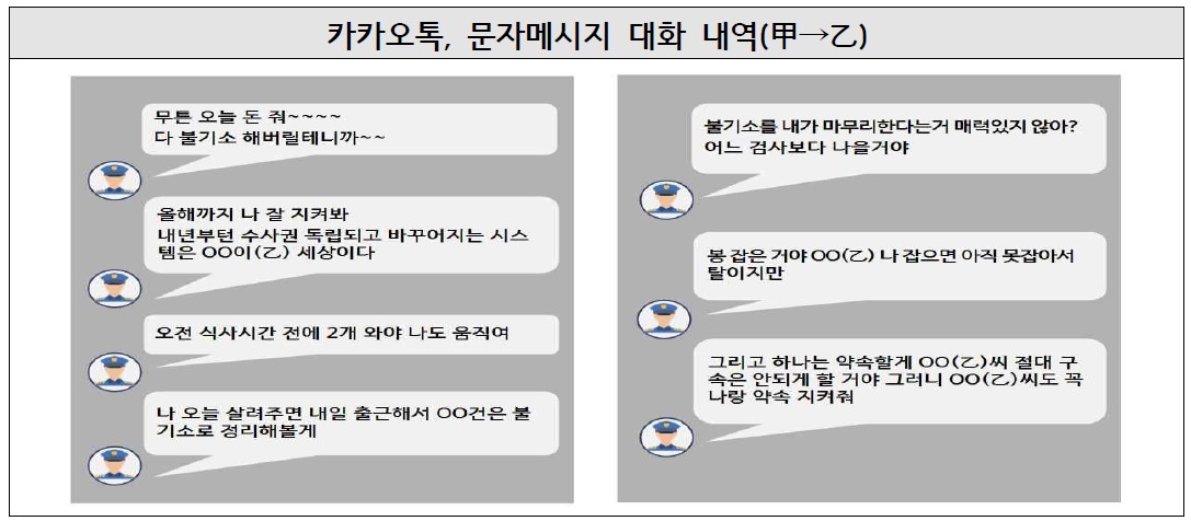 ❍ 수사한 결과, 甲은 사법경찰관의 권한을 남용하여 각종 불법행위를 통해형사사법질서를 어지럽힌 것으로 확인됨 - 甲은 여러 건의 사기 사건으로 경찰 수사를 받던 乙에게 “사건을 모아서 모두 불기소 해주겠다.”며 적극적으로 뇌물을 요구하여 2억원이넘는 금액을 수수하였고,