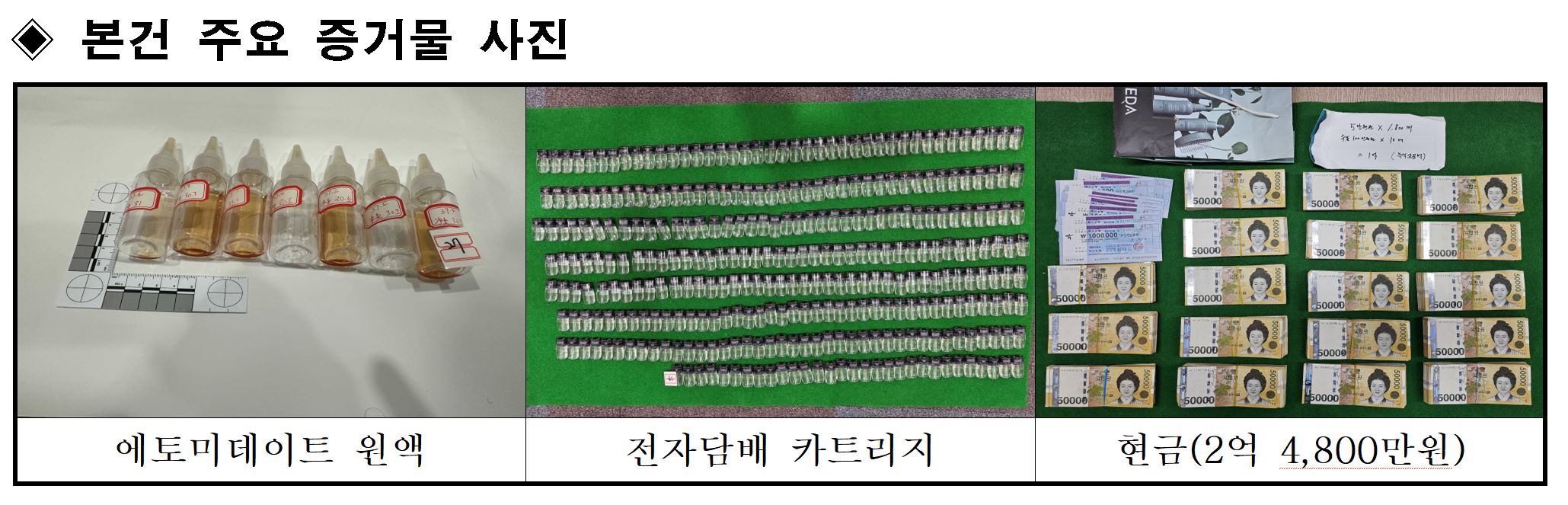 ❍ 그리고 피의자들 검거 과정에서 전문의약품 1,500ml(에토미데이트 750ml, 프로폭세이트 750ml), 액상담배 432ml, 부정의약품이 담긴 전자담배 카트리지 513개, 현금 2억 4,800만원을 압수하였다.
