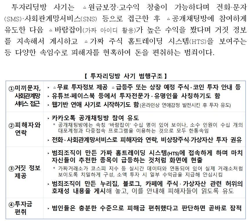 위의 사례는 카카오톡ㆍ유튜브 등 사회관계망서비스에서 가상자산 가격변동을 통해 고수익을 낼 수 있을 것처럼 속여서 돈을 편취했던 사건으로, 최근에는 ▵태양열·부동산 등 ▵가상자산 ▵비상장주식 투자 등 다양한 사업을 범행수단으로 이용하고 있다. 다만, 어떤 명목이든지 ‘고수익을 낼 수 있다며 현혹하여 돈을 편취하는 수법’은 여전히 대부분의 투자리딩방 사기에서 공통으로 확인되고 있다.