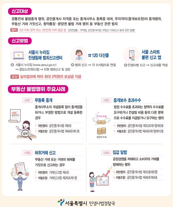 □ 서울시 민생사법경찰국은 2~3월 토지거래허가구역 지정 해제 기간 중, 거래량 증가와 매매 호가 상승 분위기를 틈타 집값 담합, 허위거래 신고, 무등록 중개, 중개보수 초과 수수 등 부동산 거래질서 교란행위에 대한 집중 수사를 3월부터 진행 중이라고 밝혔다.
