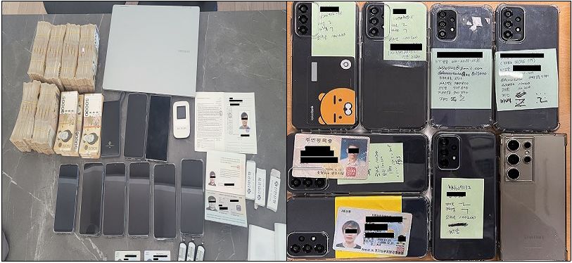 ❍ 경찰은 금융영장 집행 및 계좌추적을 통해 총책 A씨를 특정해 ’25. 1.경 총책 A씨를 은신처에서 검거하였고, 현장에서 현금 1억 6,700만 원, 대포통장 6개, 대포폰 9대, OTP 4개 등 범행 도구를 압수하였음