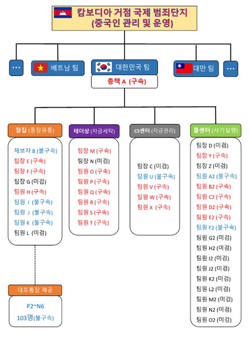 ❍ 총책 A씨의 지시를 받고 대포통장 유통팀 B씨가 대포통장 전달을 위해 캄보디아 소재 범죄단지로 갔다가 통장 사고(지급정지)로 감금·폭행을 당했고, 범죄단지를 탈출 후 경찰에 제보하면서 수사가 이루어졌음