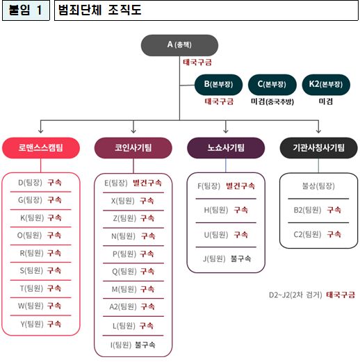 ❍ A는 태국에서 ‘룽거컴퍼니’라는 범죄단체를 조직한 뒤, ’24. 7.∼’25. 7.경 로맨스스캠팀, 코인사기팀, 노쇼사기팀, 기관사칭사기팀 등을 구성하여 국내에 있는 피해자 878명으로부터 약 210억 원을 편취한 혐의를 받고 있음