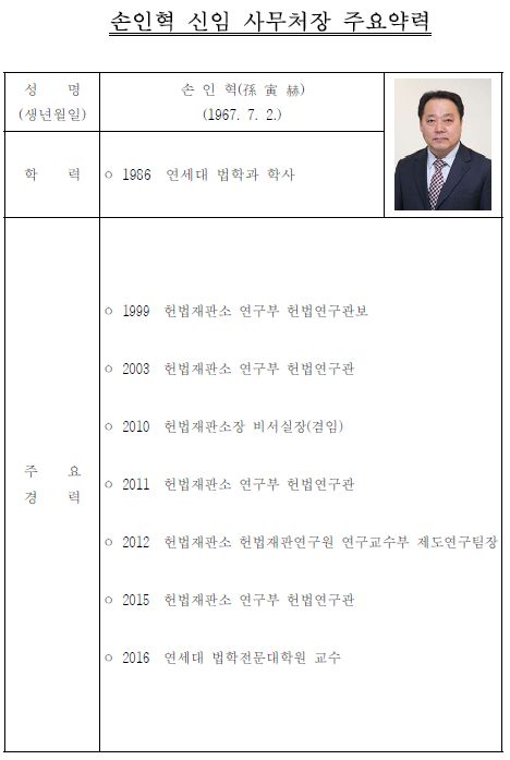 손인혁 신임 사무처장은 연세대 법학과를 졸업하고 제38회 사법시험에 합격한 후 1999년 헌법재판소 헌법연구관보로 공직을 시작하였고 이후 헌법연구관 재판소장 비서실장 헌법재판연구원연구교수부 제도연구팀장 등을 역임하였으며 2015년 3월 퇴임 후 연세대 법학전문대학원 교수로 재직 중이다