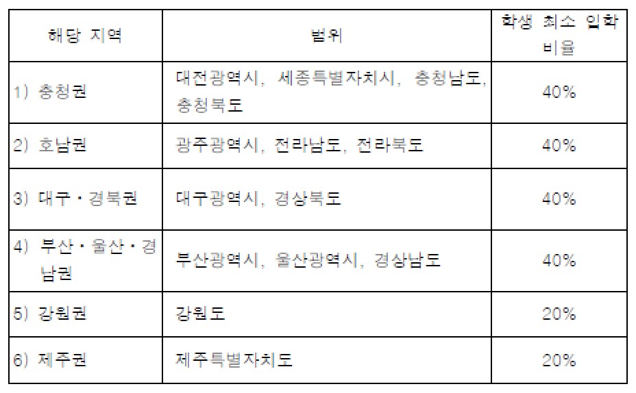 1. 지방대학(법 제15조 제2항에 따른 해당 지역의 범위 및 학생 입학 비율)