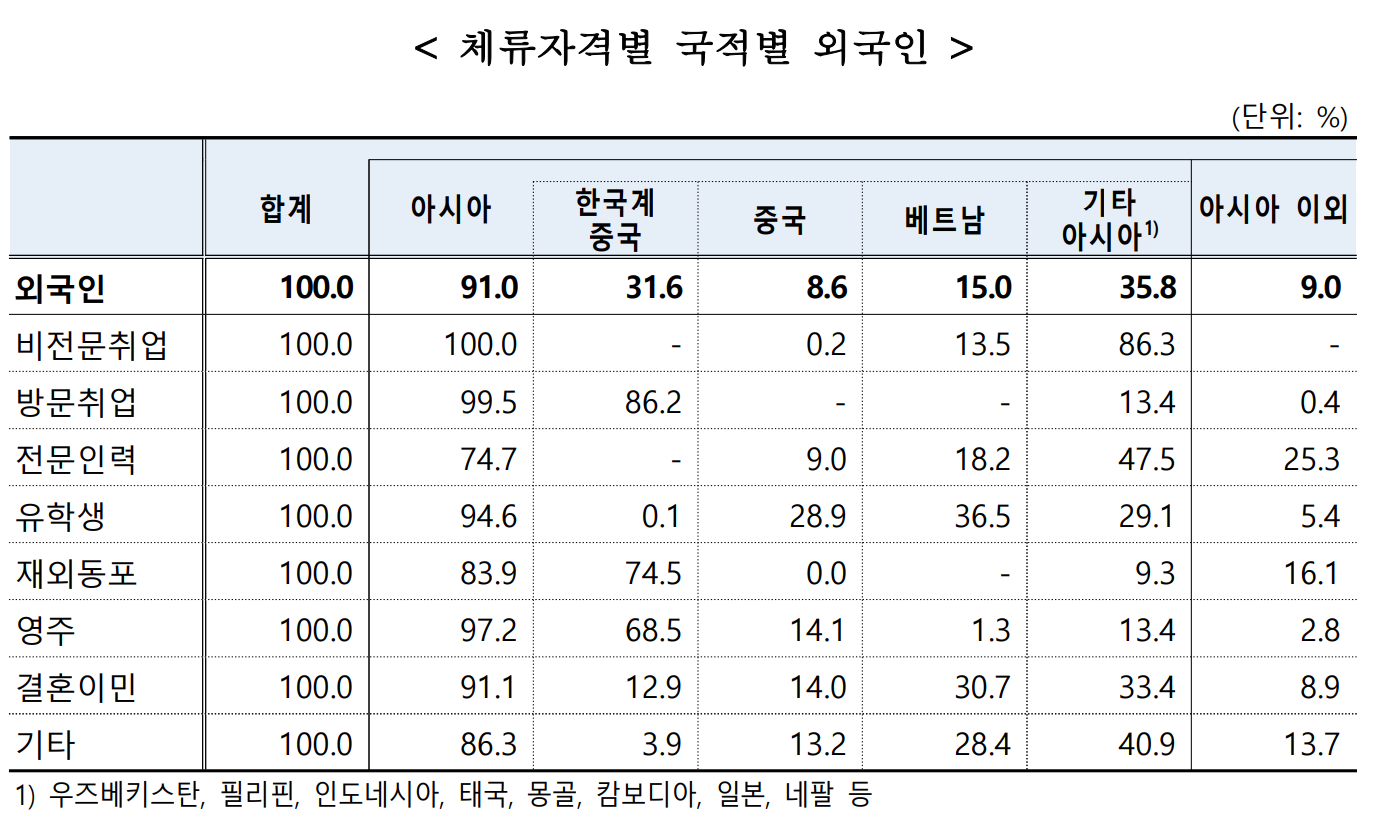 ㅇ (국적) 한국계중국 국적자 비중은 방문취업(86.2%), 재외동포(74.5%) 등이 높고, 비전문취업은 기타아시아(86.3%)와 베트남(13.5%) 비중이 높음