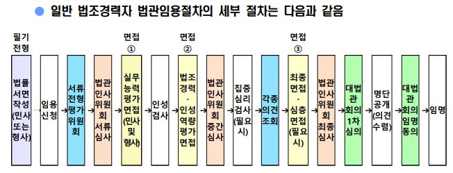 ● 2025년 법관임용절차는 법조경력을 기준으로 다음과 같이 두 종류로 나누어 진행하고 있음 - 일반 법조경력자 법관임용절차: 법조경력 5년 이상 - 전담법관 임용절차: 법조경력 20년 이상