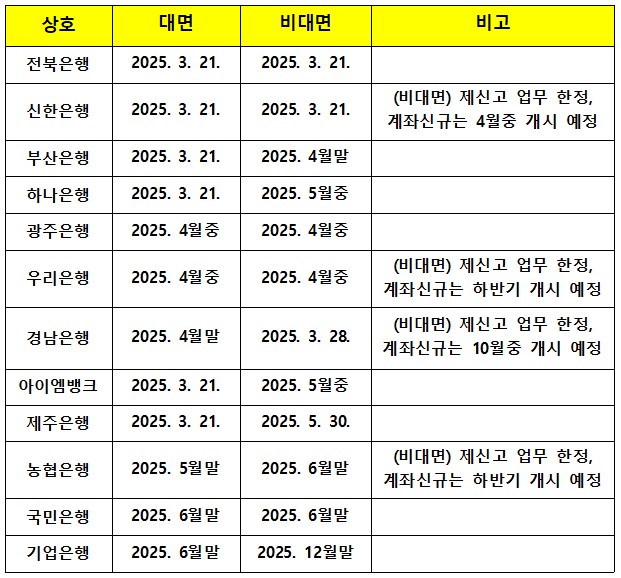 * 대면 업무처리 가능 은행: 신한, 하나, 아이엠뱅크, 부산, 전북, 제주
